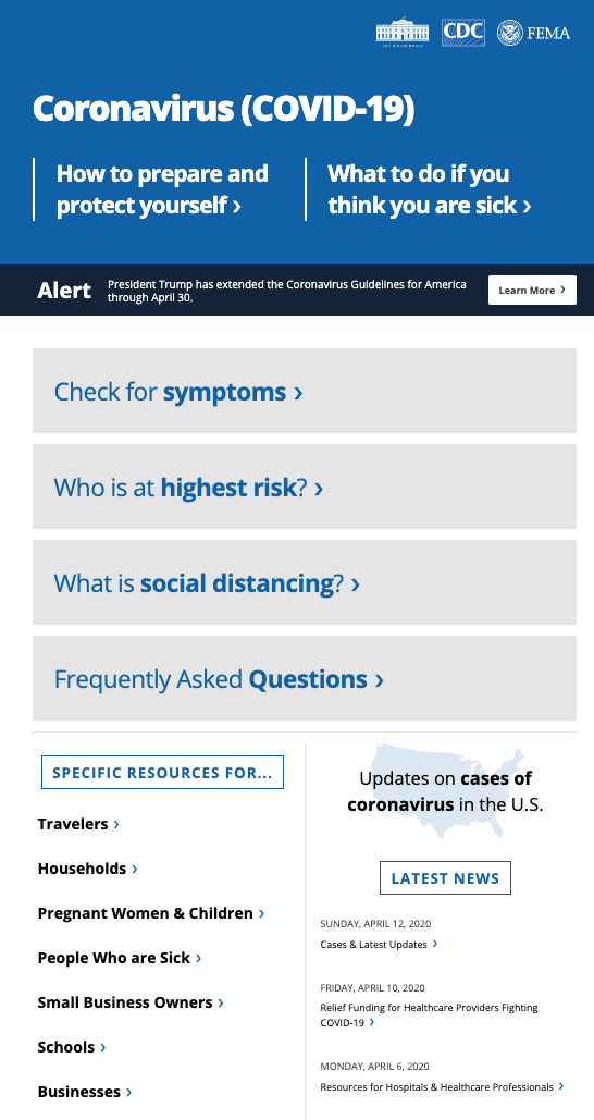 For very detailed information or guidelines that are geared towards specific audiences (such as healthcare professionals, travelers, pregnant people, etc), point them towards the pages that are written and maintained by the CDC. The CDC has the most reliable and detailed information and directions out there so far. There is no reason to duplicate and maintain this content separately. Coronavirus.gov, the coronavirus information portal created and maintained by the White House Coronavirus Task Force, is a great example of how to do this well. The vast majority of the buttons and links in the below screenshot link out to pages on the CDC site.