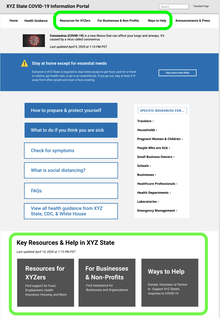 Clicking on each of these sections can direct users to a page containing links that pertain to those resources. NYC’s Coronavirus Information Portal does this very well. They feature the resources prominently on their coronavirus portal homepage, and clicking on each link provides users with a page that has useful links, sorted by category.
